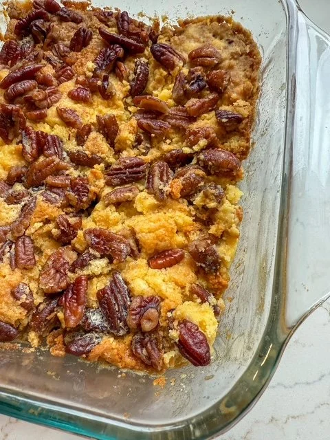 4. In the 9” x 13” pan, layer together all the ingredients. Pumpkin layer, cake layer, chopped pecan layer, and butter layer on top.