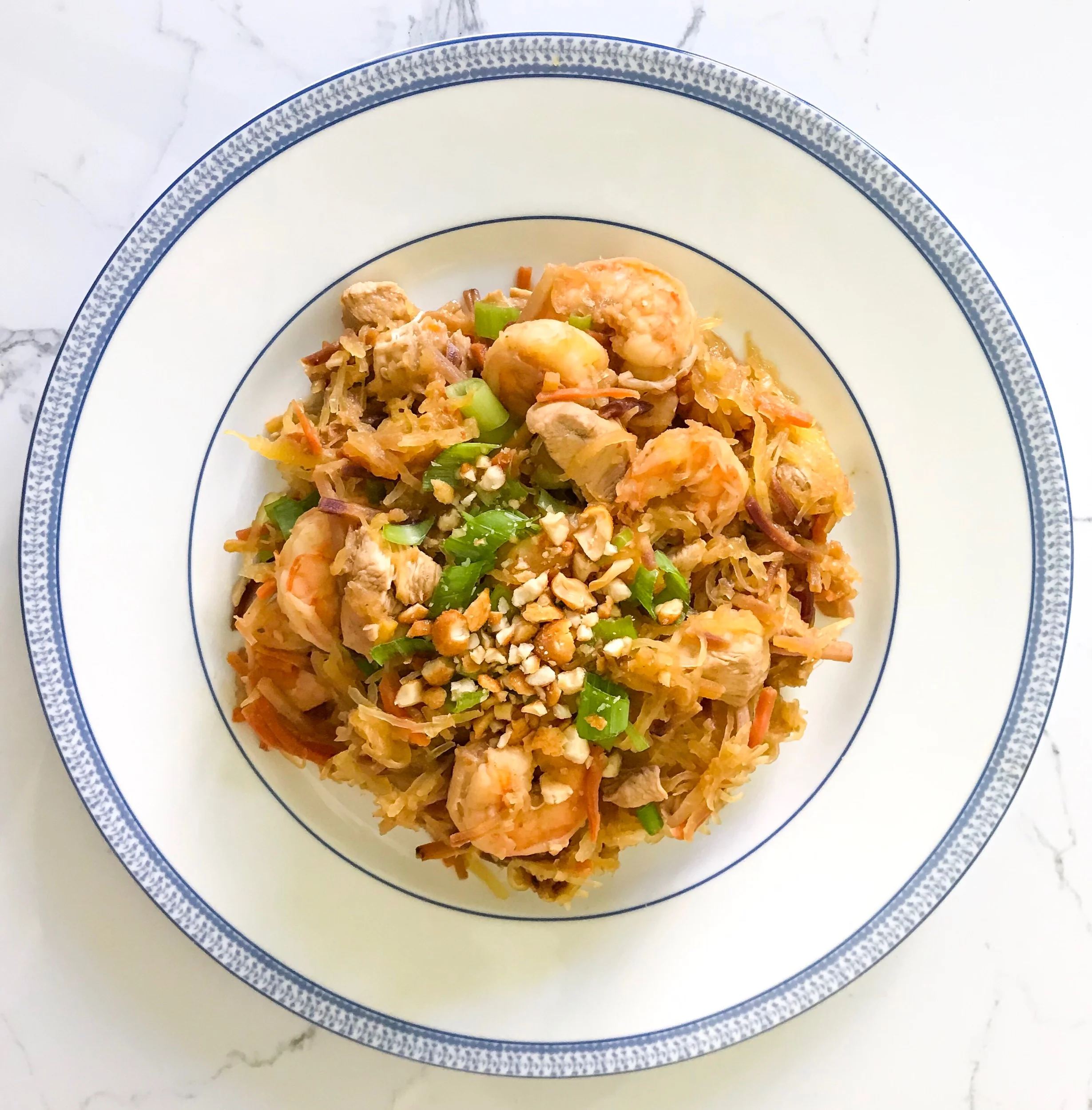 Add another splash of oil or cooking oil spray (to say fat content macros) to the now empty pan and then add garlic, onion, and carrots and cook until soft, about 5-7 minutes. Add in bean sprouts, 1/2 of the scallions, 3 cups of the cooked spaghetti squash and the cooked chicken and shrimp. Stir to combine and then create a well in the center of your pan and add eggs. Let cook and mix well, so that the eggs are scrambled and incorporated.